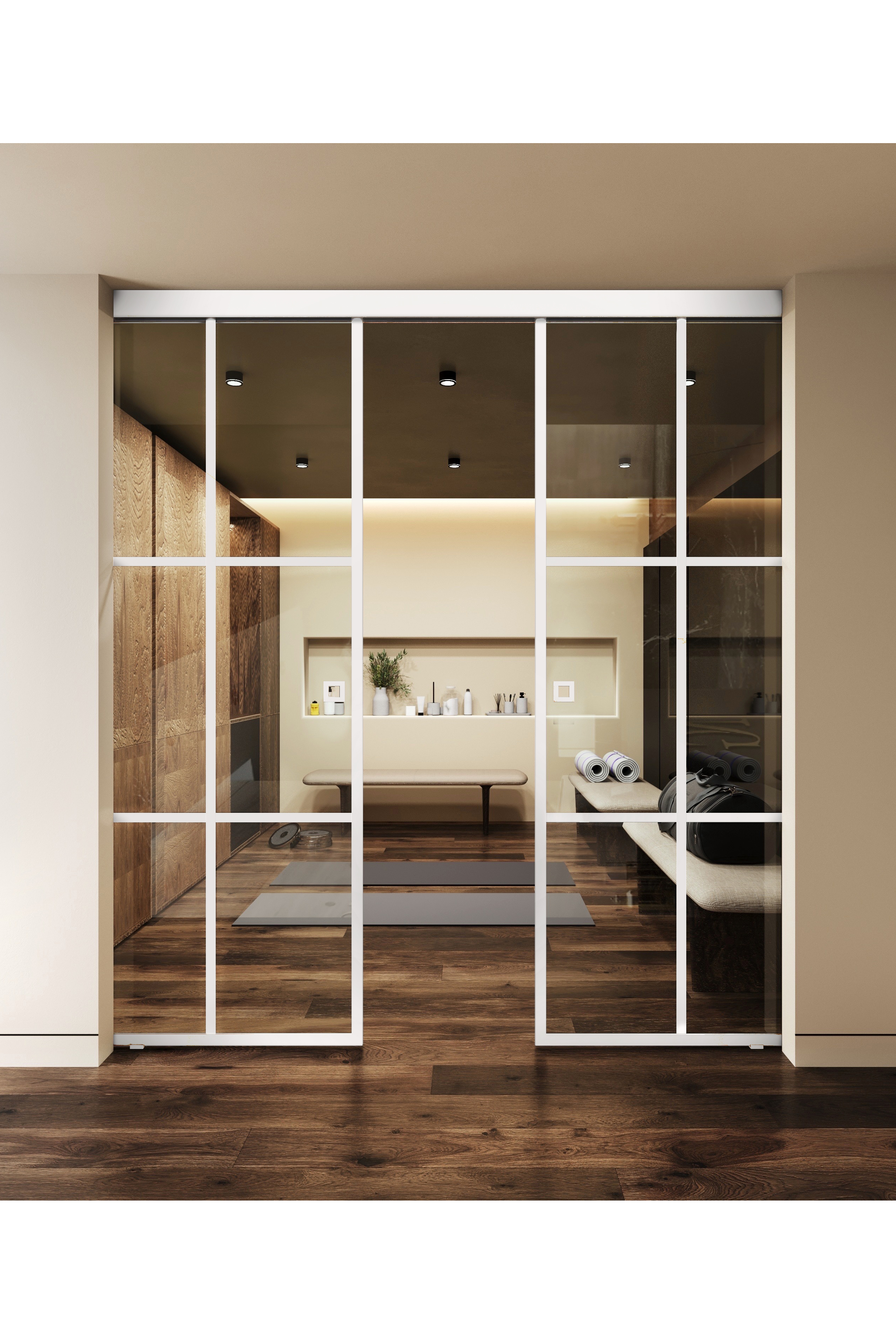 Kattokiinnitteiset liukuvat pariovet soft closing -mekanismilla