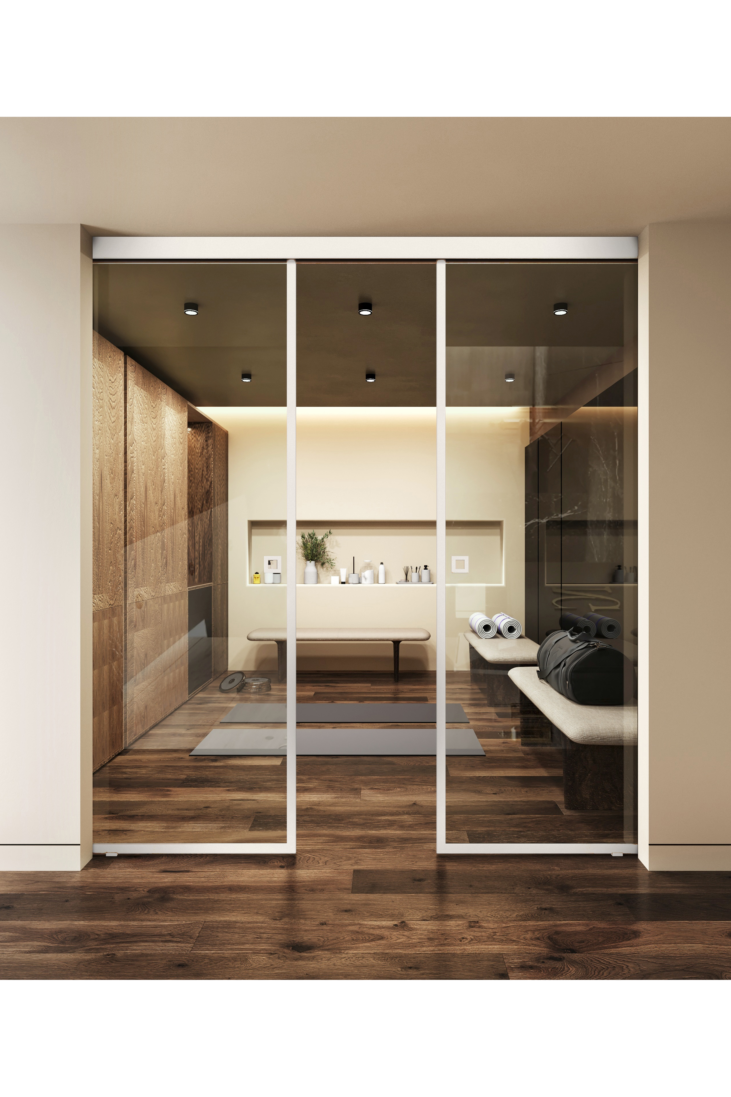 Den dubbla skjutdörren i glas består av två skjutdörrspaneler och takmonterade skjutmekanismer. Skjutsdörrsfixeringen tar upp mycket lite utrymme i rummet, en kvalitativ glidmekanism och en golvstyrning ger en jämn och säker rörelse av dörren. Dörrarna är utrustade med mjuk stängningsmekanism som mildrar stängningen och försiktigt drar dörren på plats.