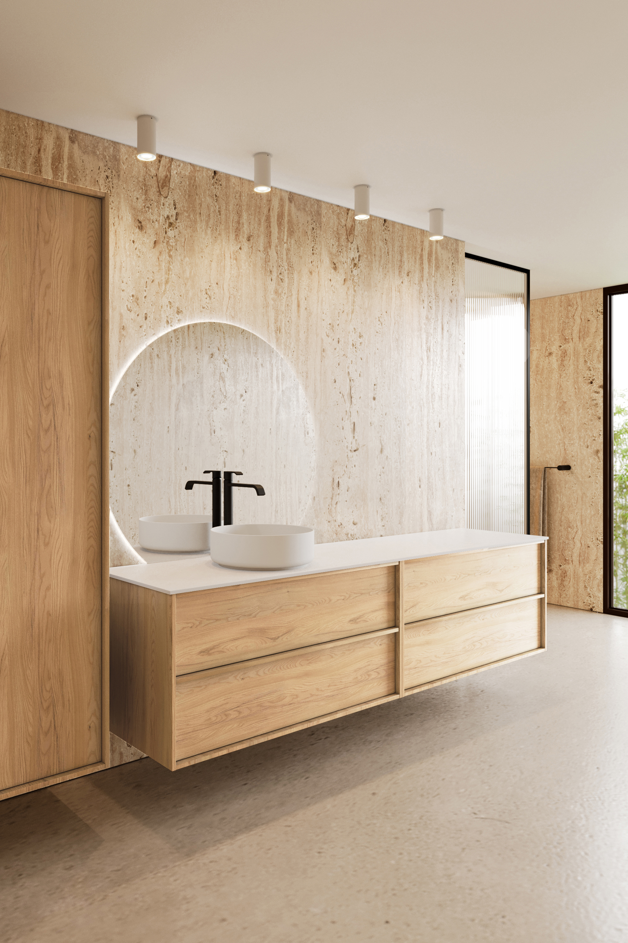 Casa -tuotesarjassa yhdistyvät pelkistetty muotoilu ja ylelliset materiaalit. Kosteudenkestävät kalusterungot on päällystetty aidolla tammella.
