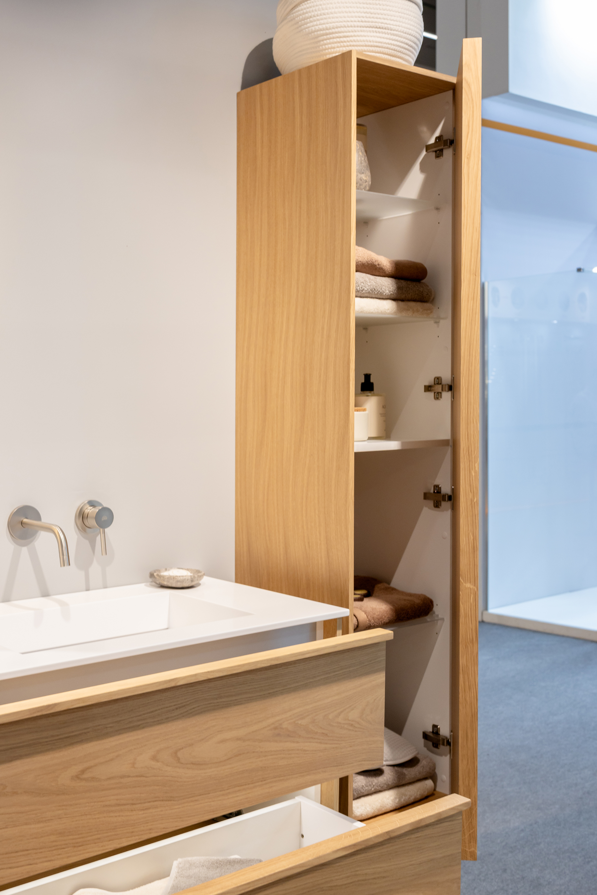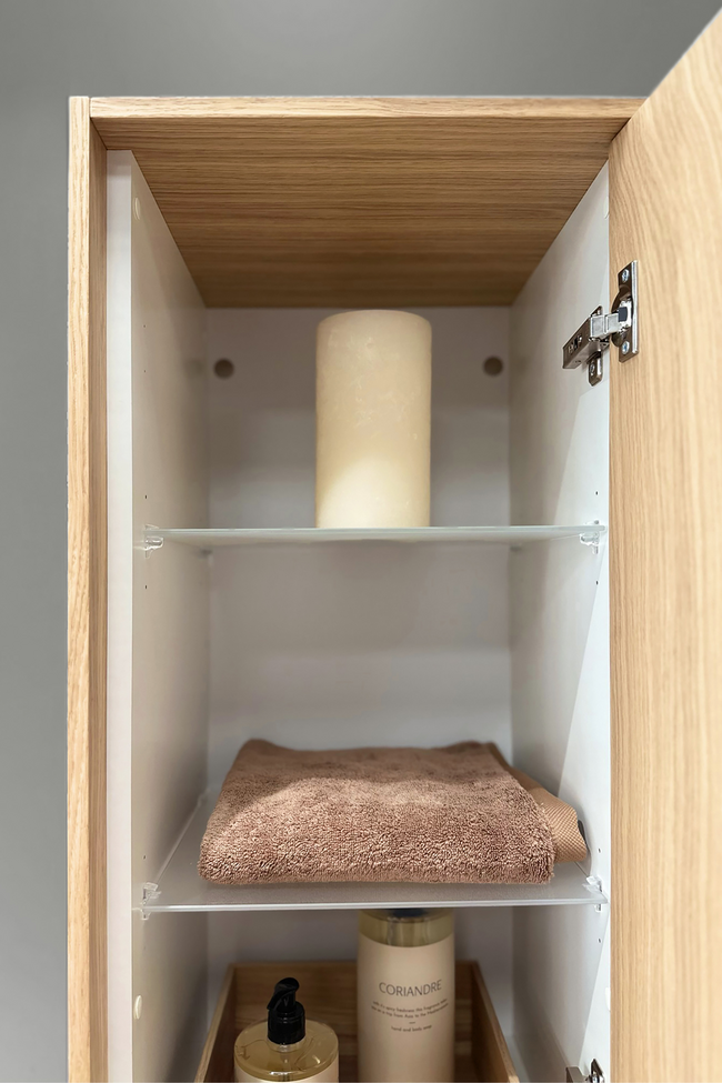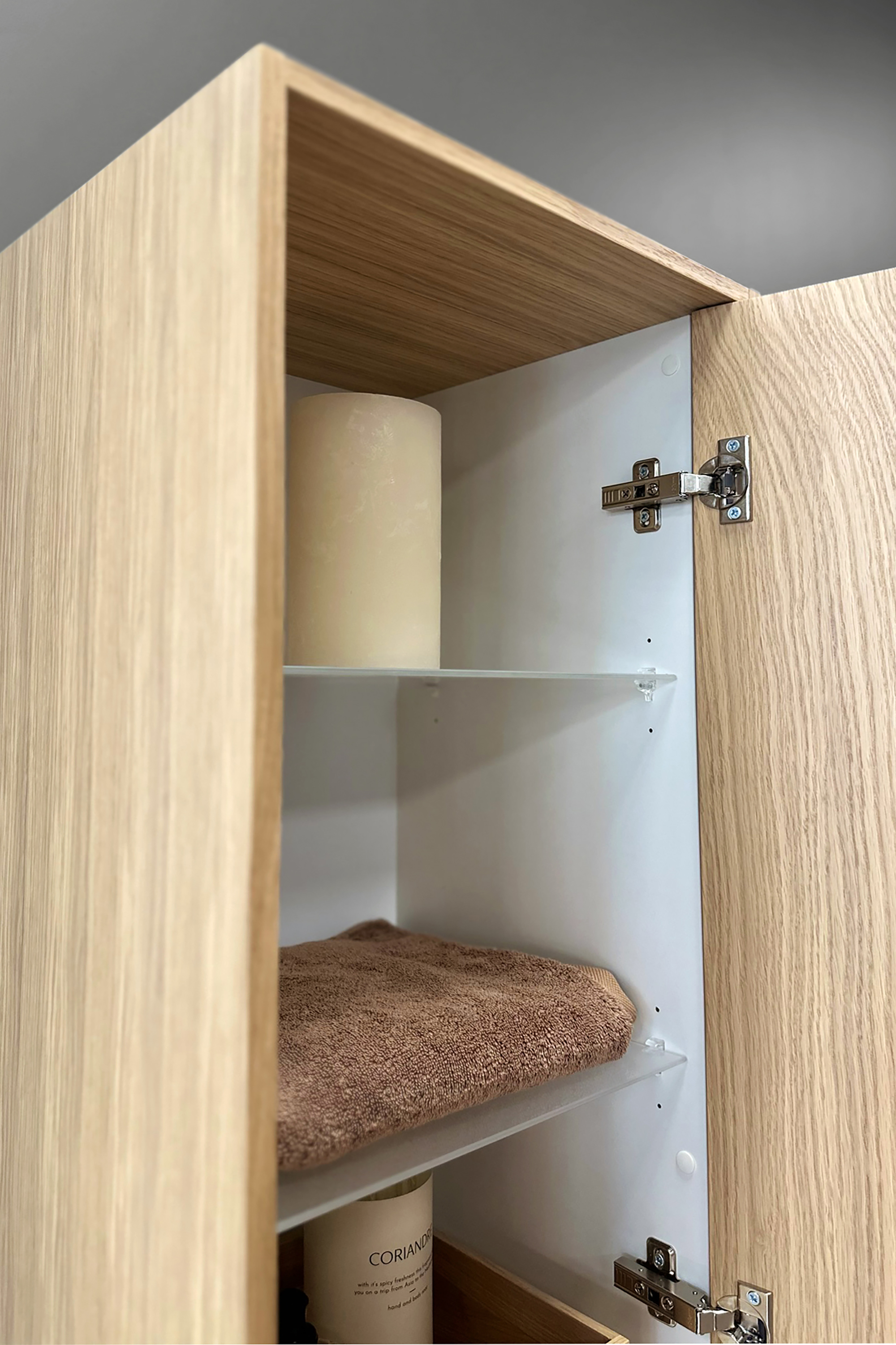 Korkea kaappi tuo lisää säilytystilaa kylpyhuoneeseen. Kaapin pintamateriaalit vastaavat allaskalusteen pintamateriaaleja. Kaappi varustetaan yhdellä ovella, jossa integroitu massiivipuu vedin. Oven kätisyys valitaan asennusvaiheessa. Kaapissa on kolme säädettävää lasihyllyä.